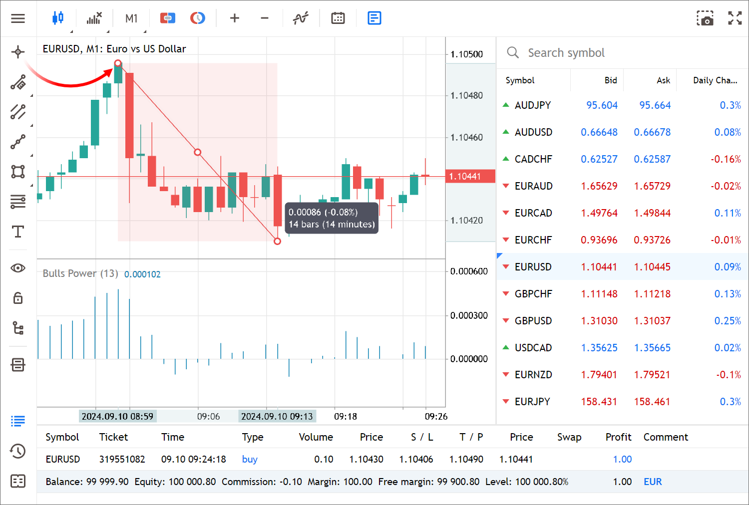 点击左侧面板上的相关按钮,启用该模式。将十字准线移至图表上的任意一点,即可在相应的坐标轴上看到日期和价格。要测量距离,请单击图表上的任意一点,然后按住鼠标键将光标拖到另一点。